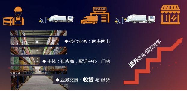 为解决供应商与配送的协调问题,先从配送中心的工作说起。对配送中心而言,主要的业务工作是常说的两进两出,即把货品的实物,从供应商处收取,经过仓储收货上架后,再有计划的分拣,配送到门店客户手上;而当门店出现退货时,仓库将其拉回,再将可退的库存统一退给供应商。