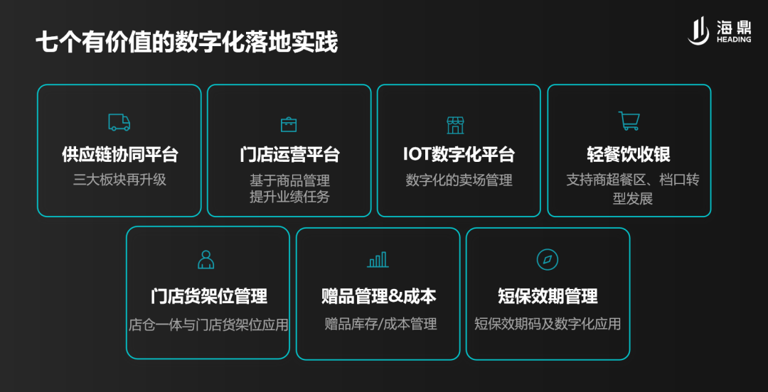 常安邦首先介绍了海鼎在超市数字化运营领域的7大落地实践:供应链协同平台、门店运营平台、IOT数字化平台、轻餐饮收银、门店货架位管理、赠品管理&成本、短保效期管理,并分别围绕实际业务场景展开介绍了这些产品和方案给客户带来的价值。