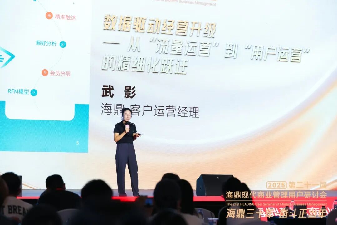 海鼎客户运营经理武影深入分享了数据驱动经营升级的策略。她指出,面对连锁零售行业的私域运营困局,需通过会员数据洞察、精准营销及分层运营来破解。通过新客运营提升企微添加率与复购率,老客复购利用周期数据锚定唤醒节点,沉睡会员则通过标签分层实现精准召回。武影强调,数据是洞察的工具,精细化运营需以数据为基础,读懂用户需求,用内容打动用户,助力企业构建私域高价值运营闭环。