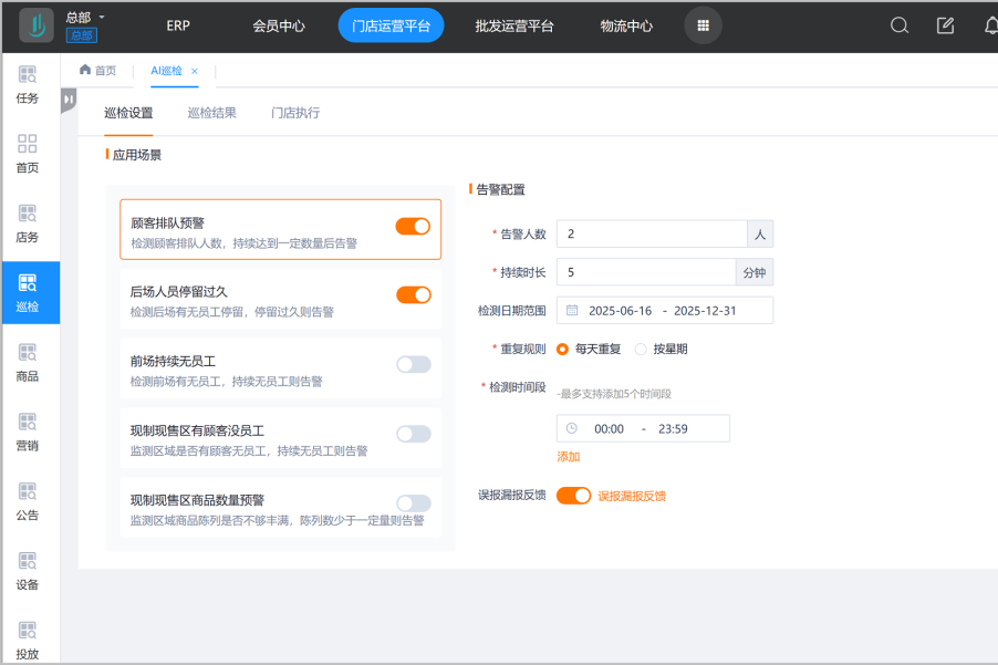 针对顾客结账排队问题,海鼎智能巡检方案还提供了智能排队检测功能。系统可以设置告警人数和间隔时间,一旦排队人数超过设定值将自动触发告警给门店人员和门店管理人员。这有助于门店及时调整收银资源,优化顾客体验,减少顾客流失,提升销售效率。